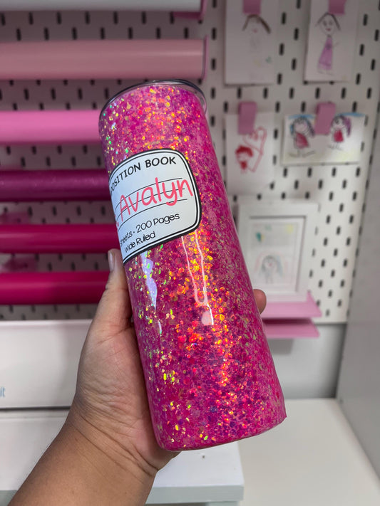 20oz Stainless Steel Glitter Pink Composition Notebook Custom Tumbler – Personalized Teacher or Student Gift