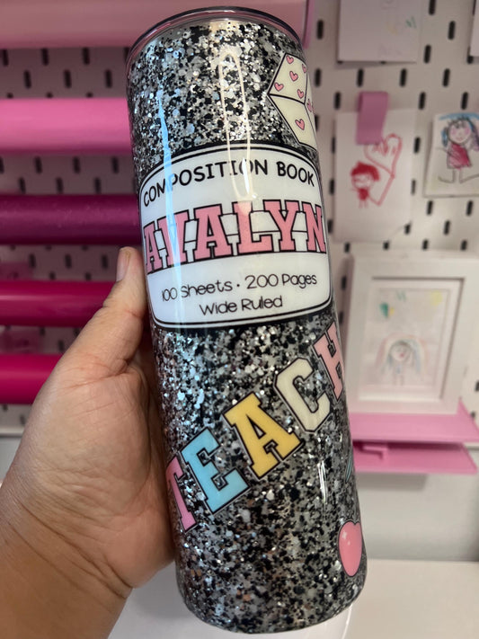 20oz Stainless Steel Glitter Composition Doodle Custom Tumbler with Straw Topper – Personalized Teacher Gift